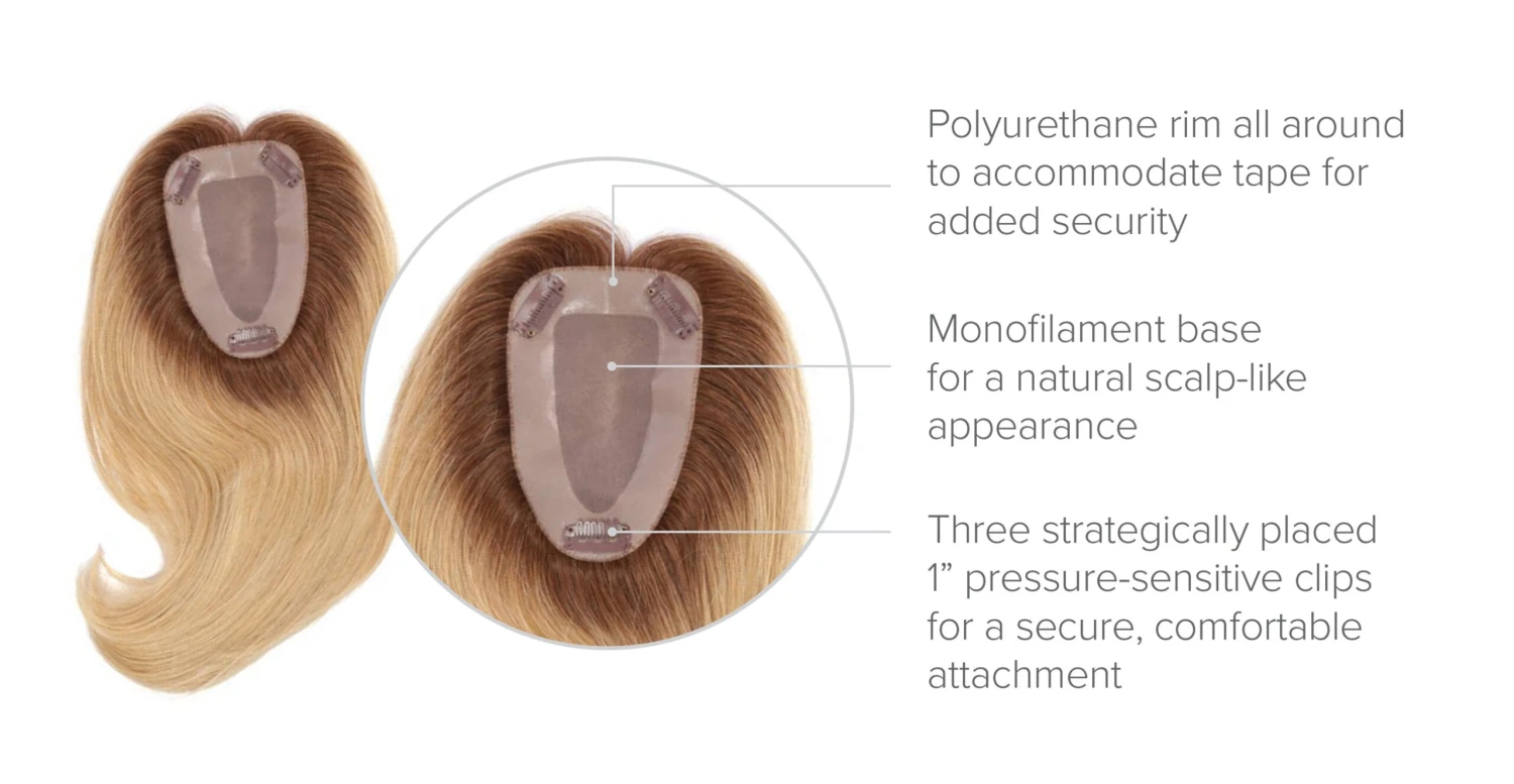Perfect for covering areas along the part line. The egg shaped construction offers you the option of placing a narrow or wider area near the face. The textured lengths blend seamlessly into mid-length or longer, layered styles while the human hair allows additional styling options.