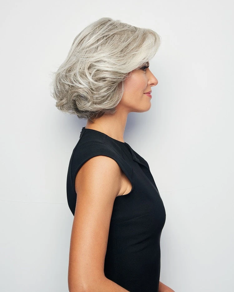 The Crowd Pleaser Wig by Raquel Welch is a stunning, polished mid-length style with light waves. It includes dramatic side swept bangs and long, subtle layering throughout.