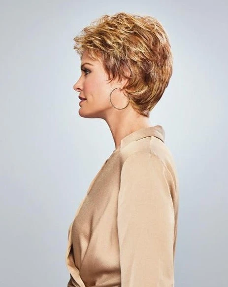 All over gently waved layers give this style sophisticated volume while softly framing the face. Delicately sculpted bangs give her the option of wearing the hair onto the face or swept away. This style also looks great with eyeglasses or tucked behind the ears!