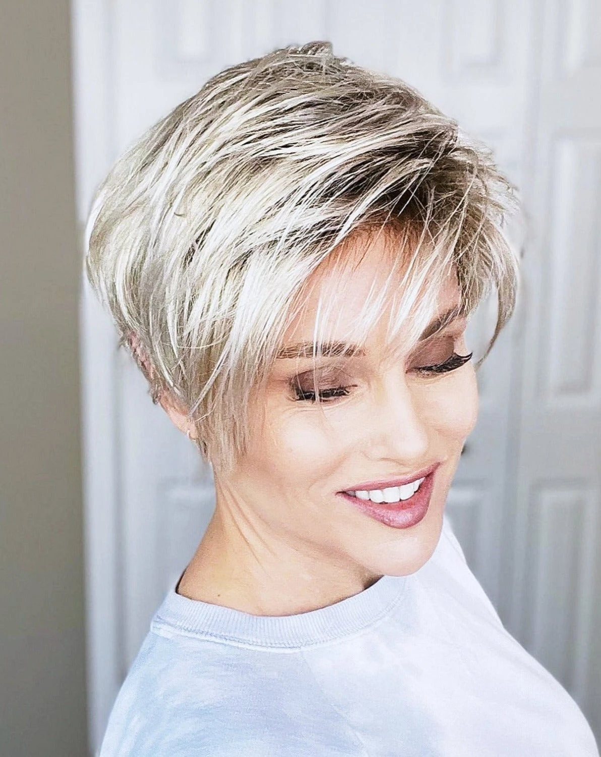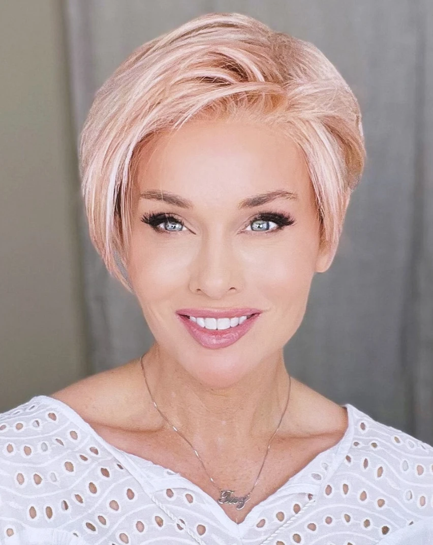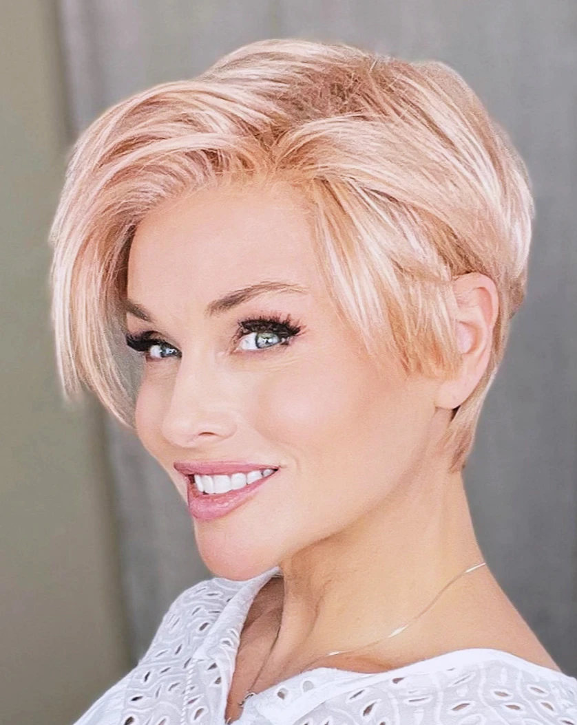Have fun with Jett, a bold, asymmetric pixie featuring a sheer lace front. Subtle layering allows for natural movement, so you can mess her up for a sleek and edgy look or keep it soft and simple.