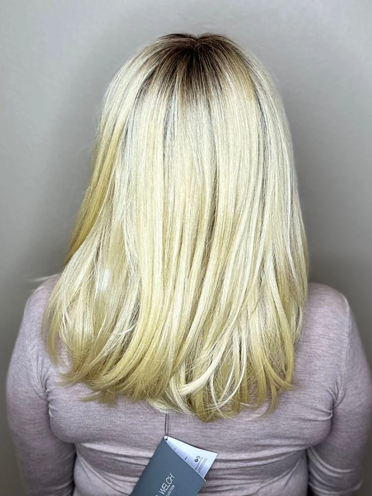 Introducing the quintessential seductive mid-length! Smooth, ample layers at the top and sides fall to below-the-shoulder. The temple-to-temple lace front with a center monofilament part makes this style up-to-date and on trend.