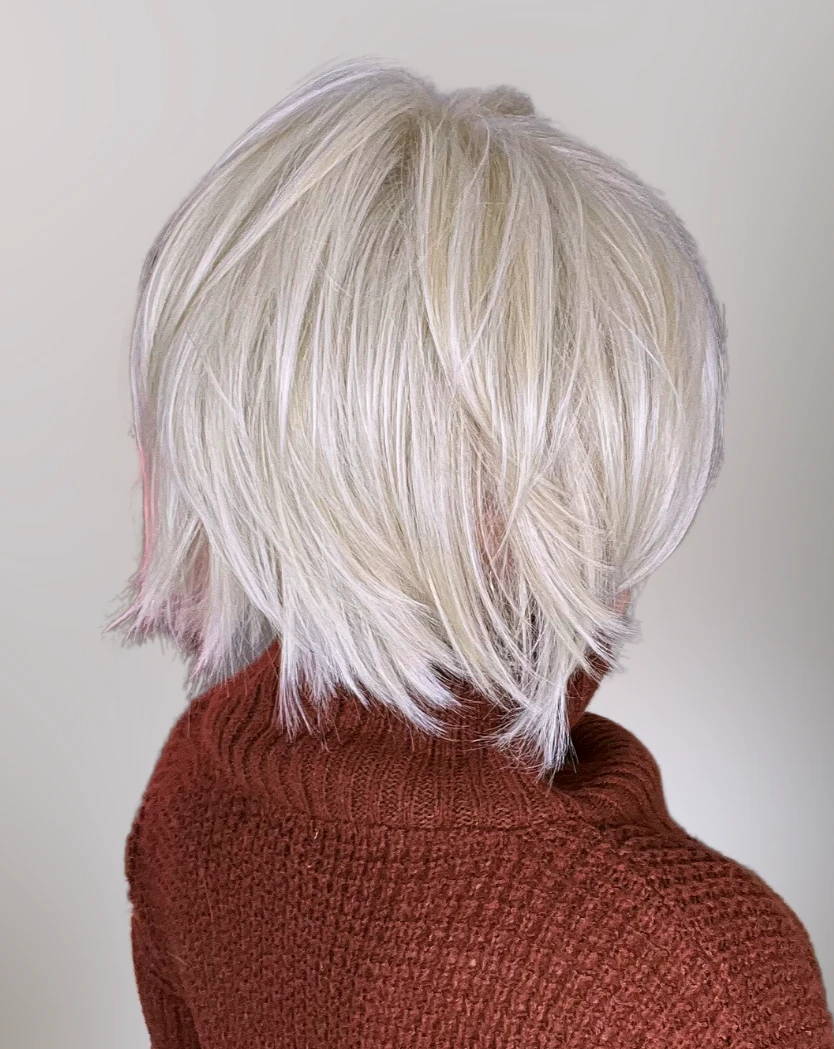 Shattered ends and razor-cut lengths give this modern bob both popular and practical appeal. The close fitting nape and flattering eyelash bang work together to create a confident look that’s also very feminine. Heat style the ends turned under or with a sassy upwards flick. Try wearing with one side tucked behind the ear.