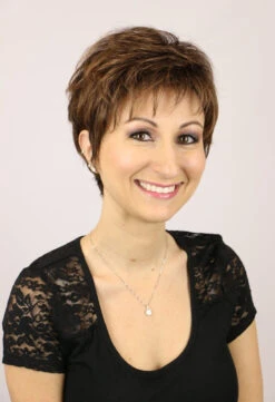 Shown in Toasted Brown.  Large Sheila is a large size wig with a 23″ circumference.  She is the perfect razor cut pixie wig. She is extremely light weight and comfortable. The soft wave in the layers gives it a chic, but fun look. Â