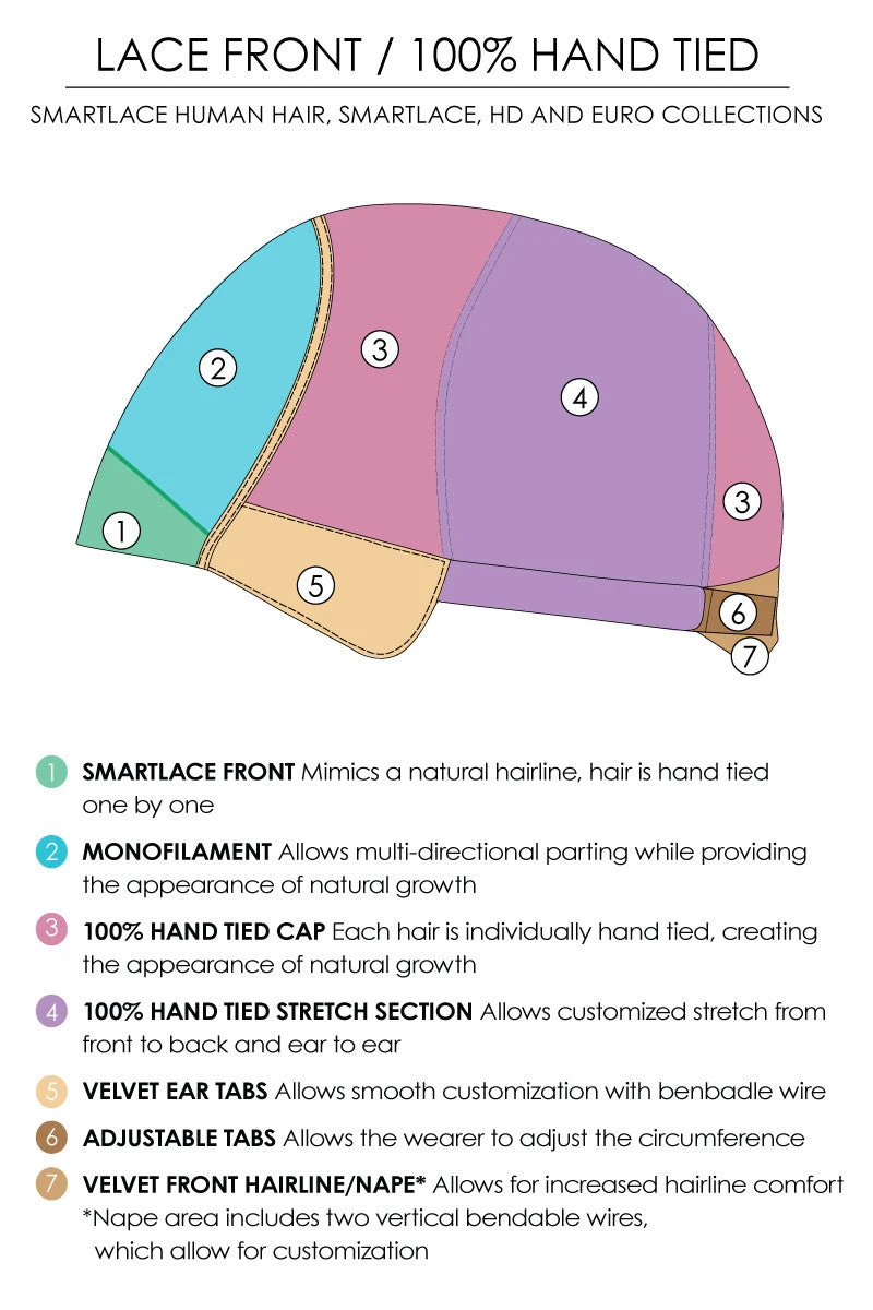 100% Hand Tied Monofilament Cap Construction – The hand-tied, monofilament cap construction allows for multi-directional parting with the illusion of natural hair growth at the part, along with natural movement of the hair, providing a comfortable and natural look and feel.Â