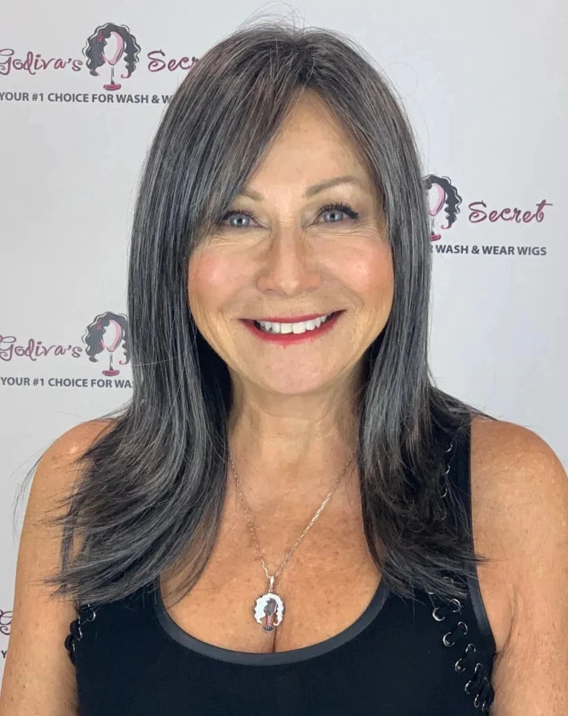 Taylor is a beautiful long wispy straight wig style with face-framing bangs.