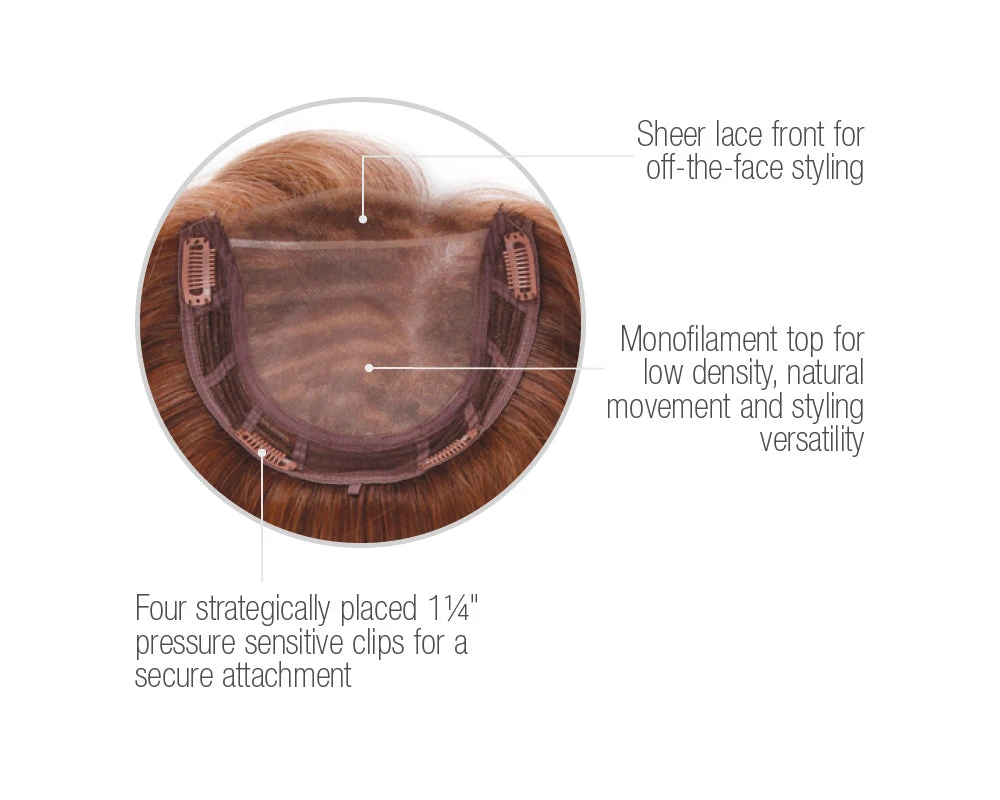 Raquel Welch Top Billing features a Sheer Indulgence lace front with a monofilament top and 4 strategically placed pressure-sensitive clips for a secure fit.