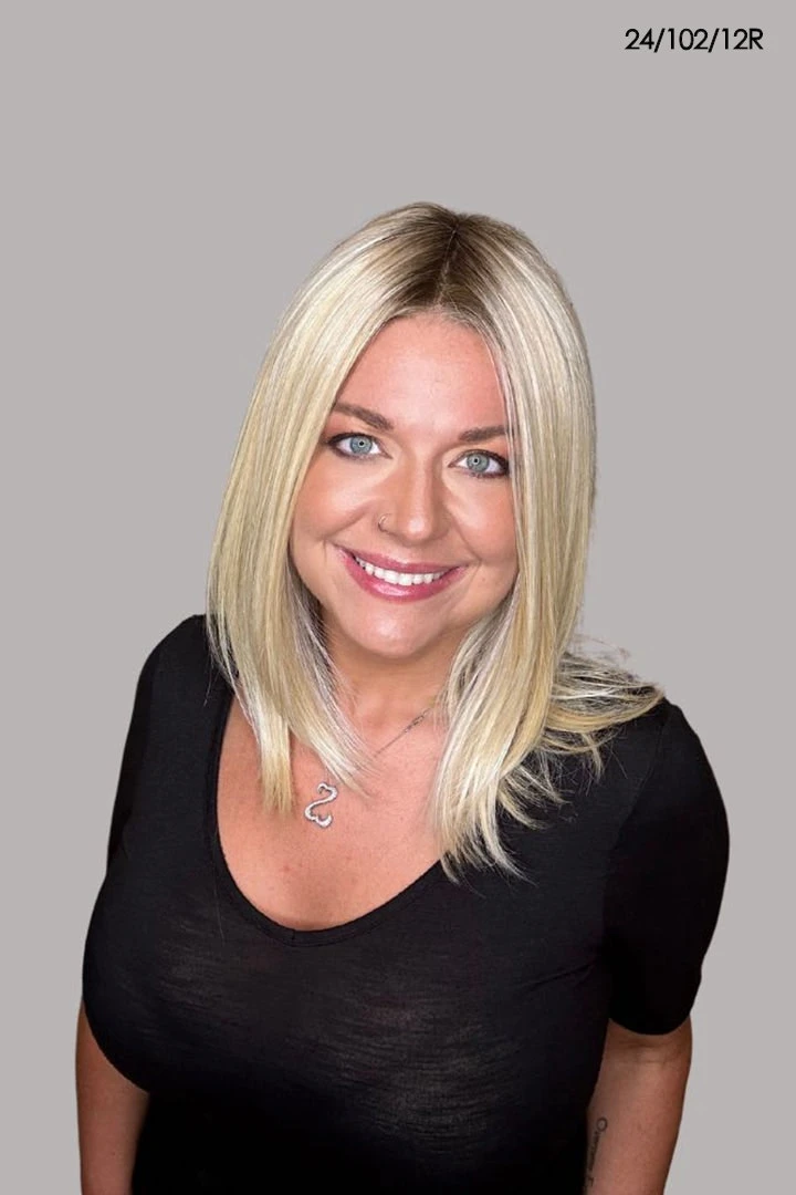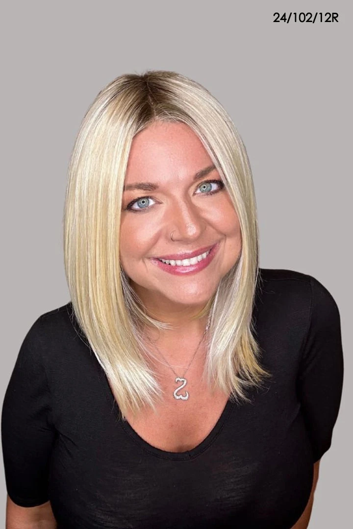 This classic long bob, also known as the “lob,” is a sophisticated, versatile, and timeless hairstyle that falls between shoulder and collarbone length. Smooth layers of low-density strand-by-strand Style-Able Effortlessâ„¢ synthetic fiber are double hand–knotted into a sheer monofilament lace front cap for a natural part anywhere and an undetectable hairline. ​Â