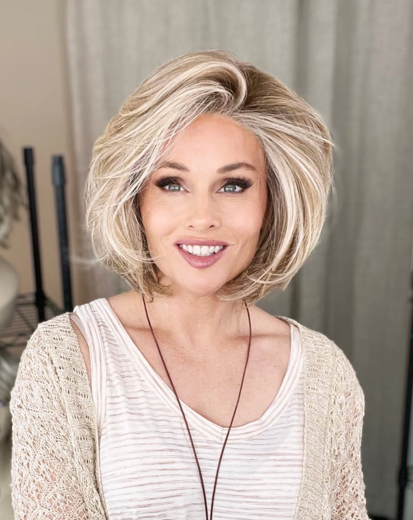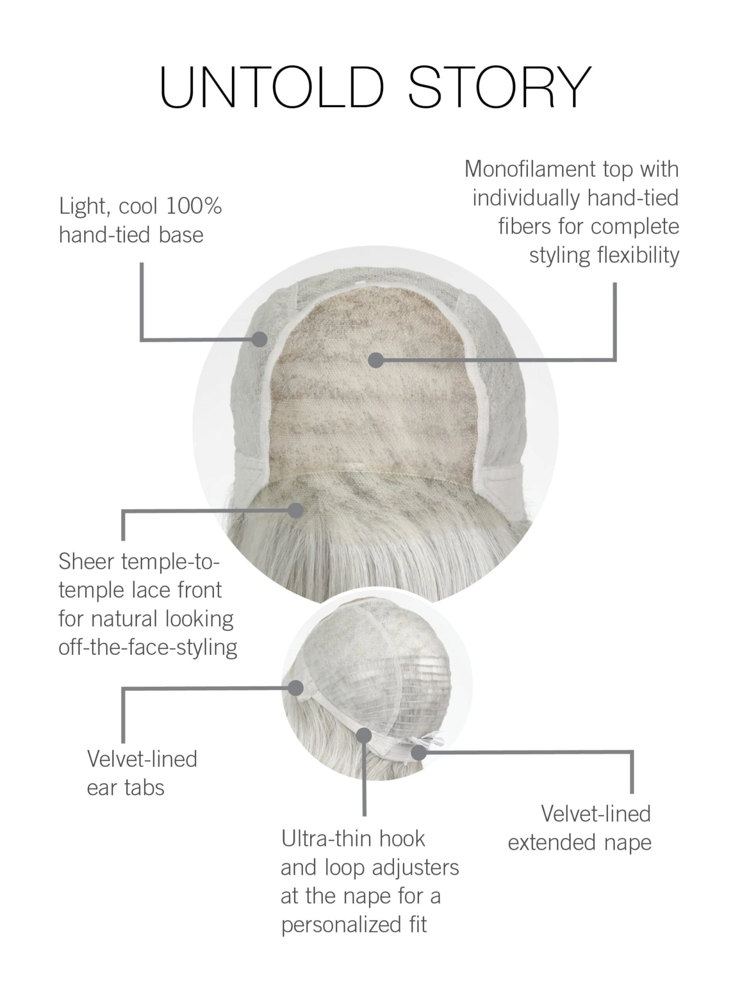 This is a tale of carefree elegance. Untold Story is completely hand-tied with a monofilament top for uncontrived beauty. Turn the page on boring with an elegant eyelash bang, and the flair of textured ends that flaunt a subtle flip. With natural looking layers, this style delivers body without bulk.Â